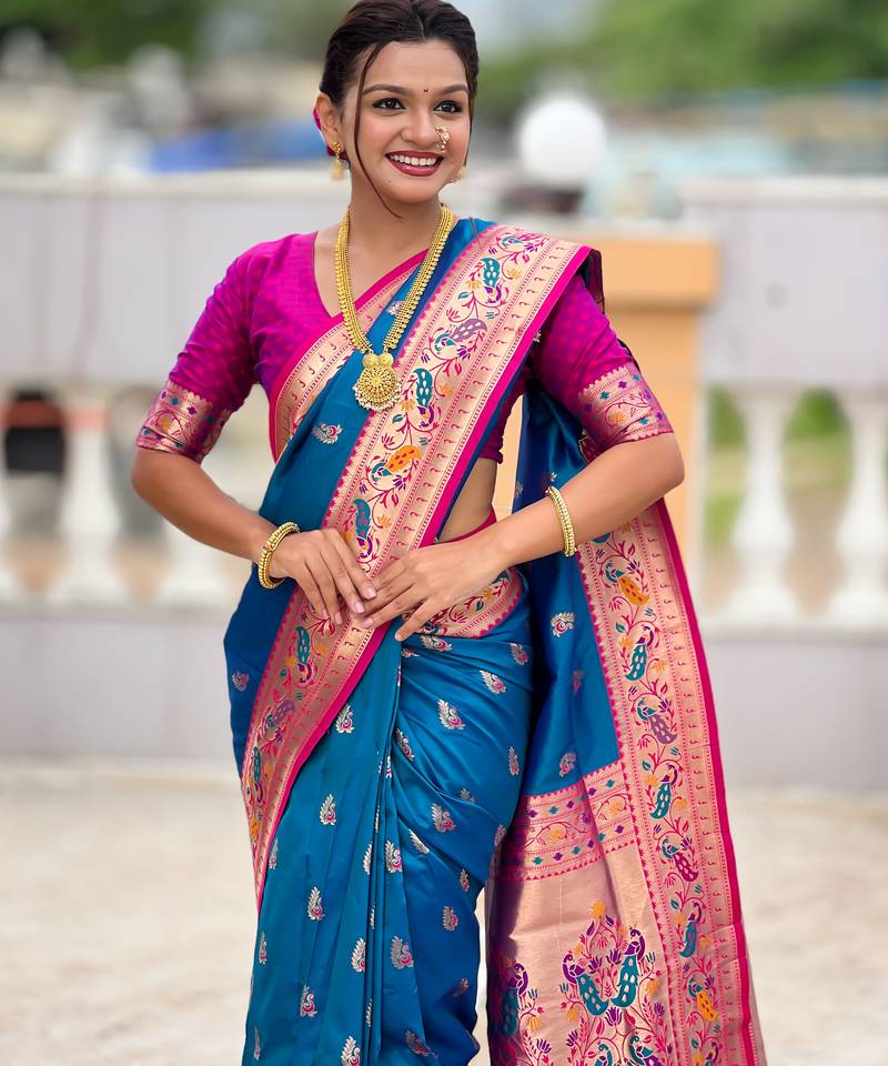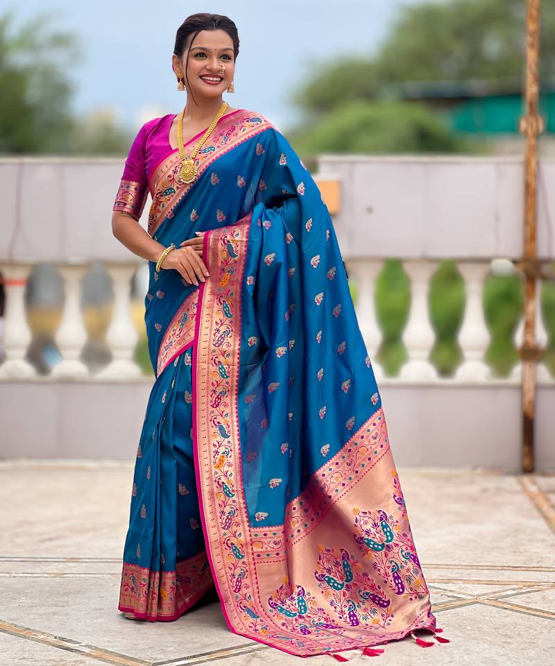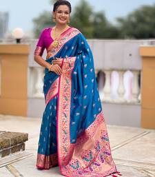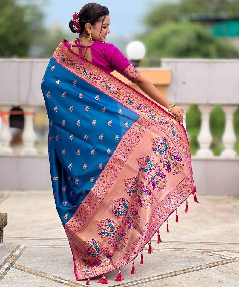 Woven meenakari jacquard designer sky blue color paithani silk blend saree