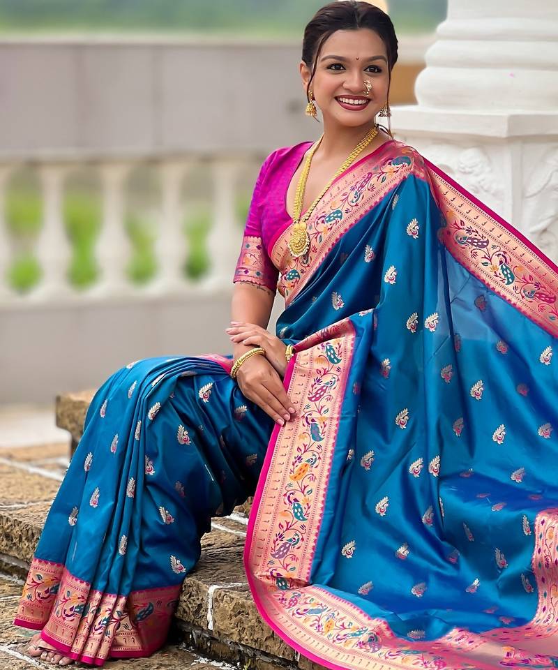 | Product Name | Woven Meenakari Jacquard Designer Sky Blue Color Paithani Silk Blend Saree | |
