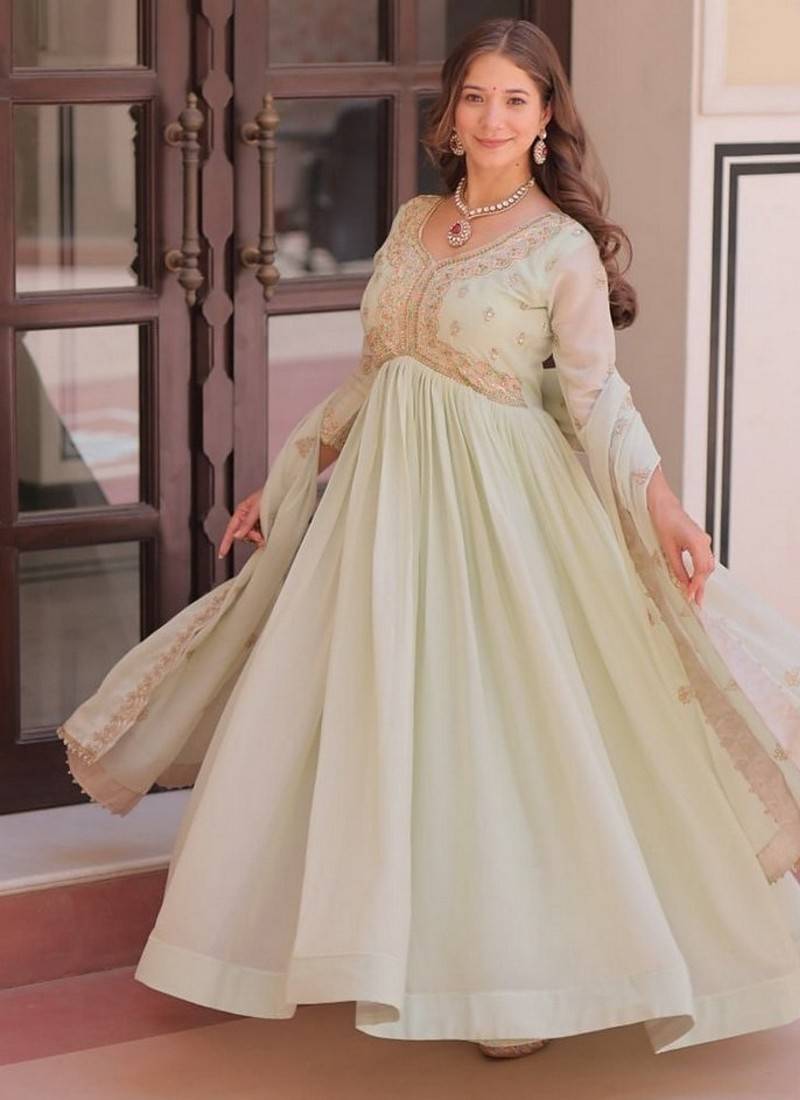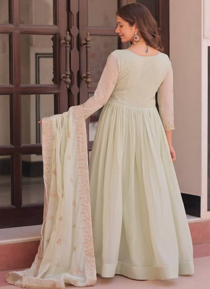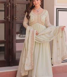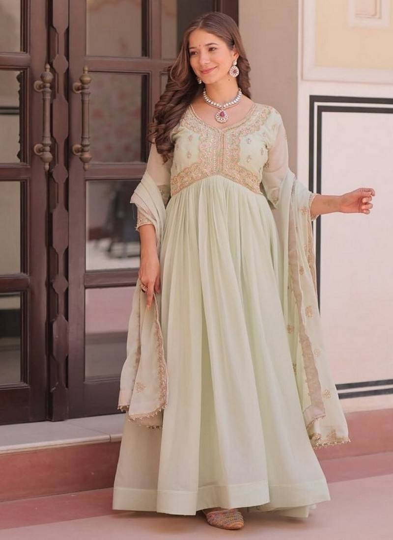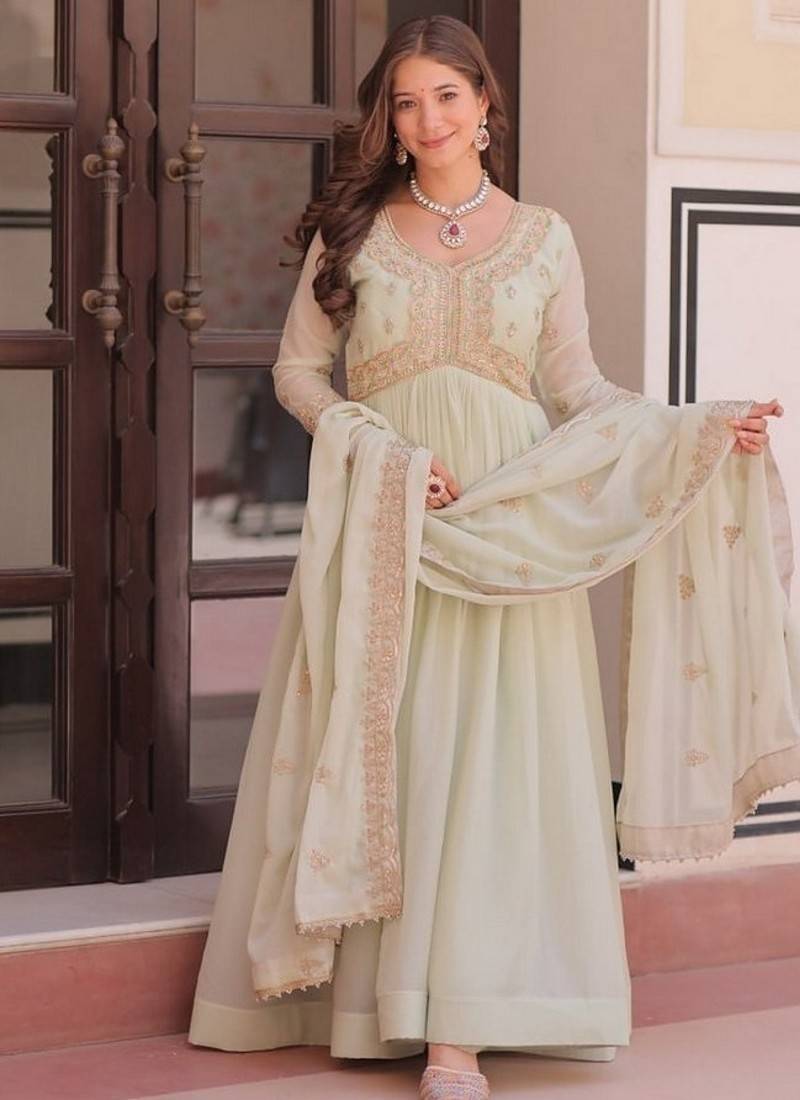 Light green zari & sequins embroidered work georgette stitched kurta & dupatta set