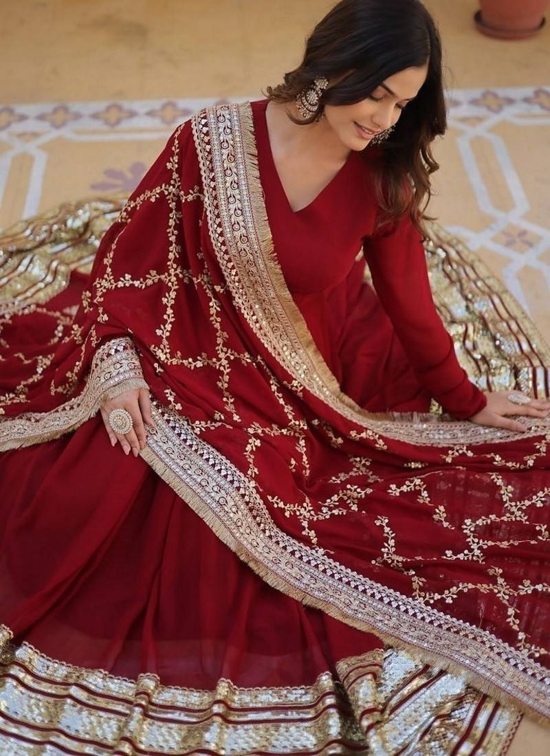 Maroon zari & sequins embroidered work georgette stitched kurta & dupatta set