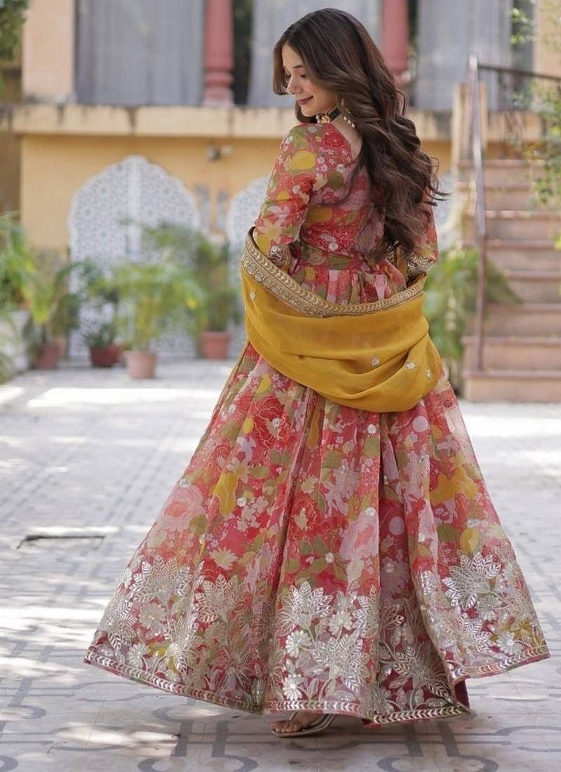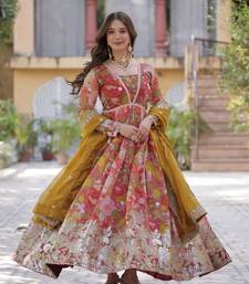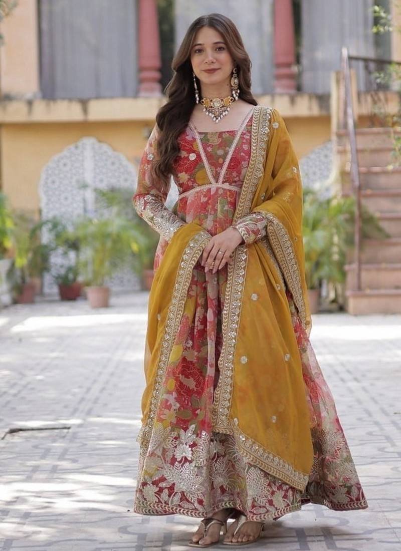 Mustard zari & sequins embroidered work russian silk stitched kurta & dupatta set