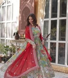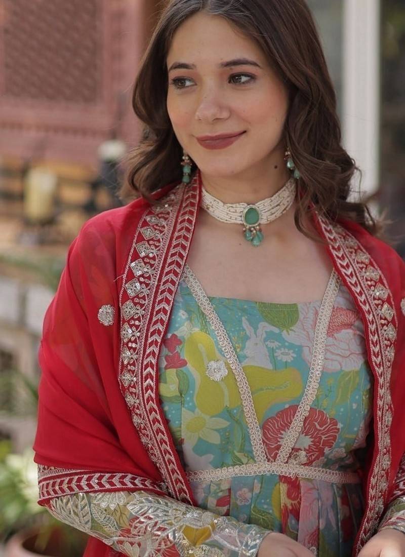 Red zari & sequins embroidered work russian silk stitched kurta & dupatta set