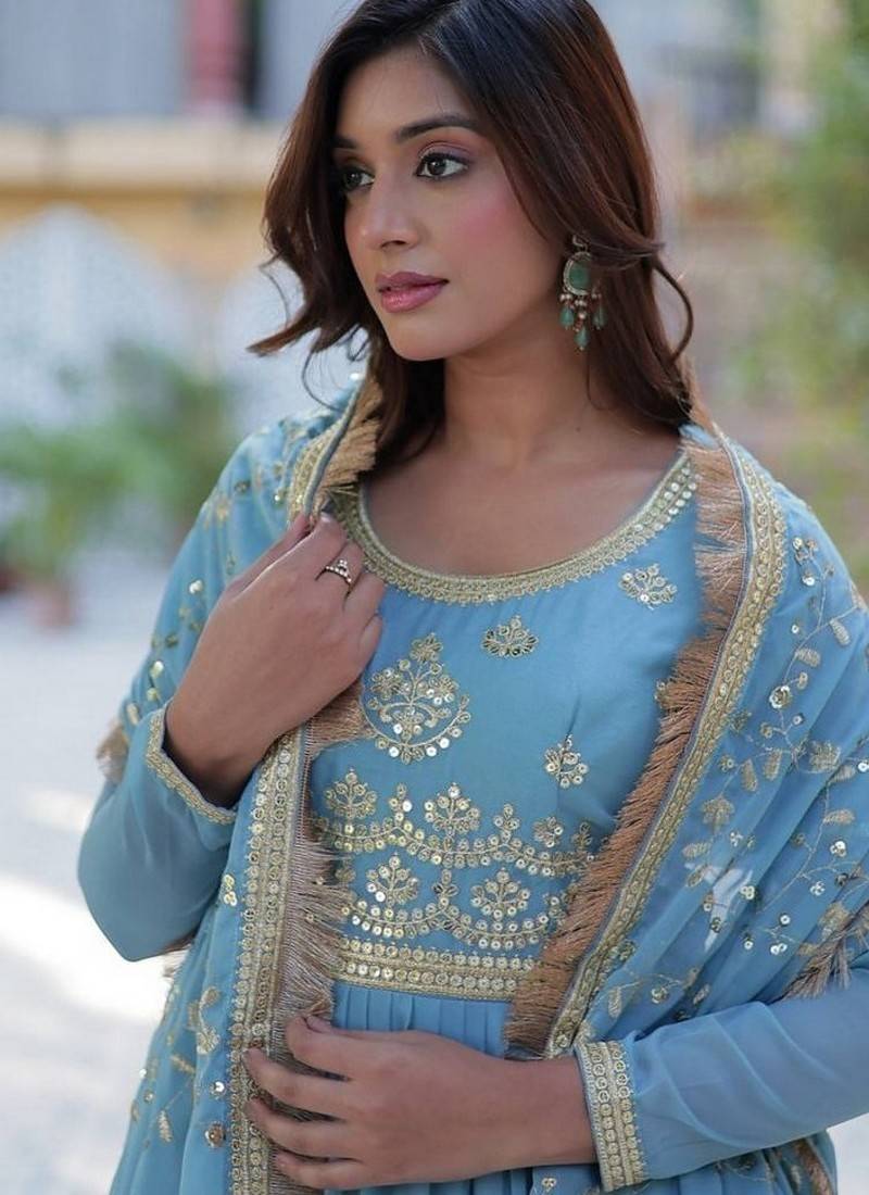 Sky zari & sequins embroidered work georgette stitched kurta & dupatta set
