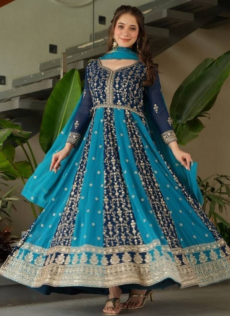 | • | Kameez | : | Color- Teal Blue / Fabric- Faux Georgette |