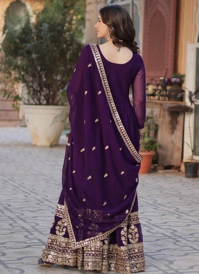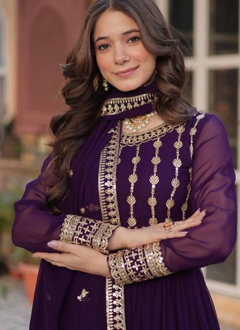 Wine zari & sequins embroidered work georgette stitched kurta & dupatta set