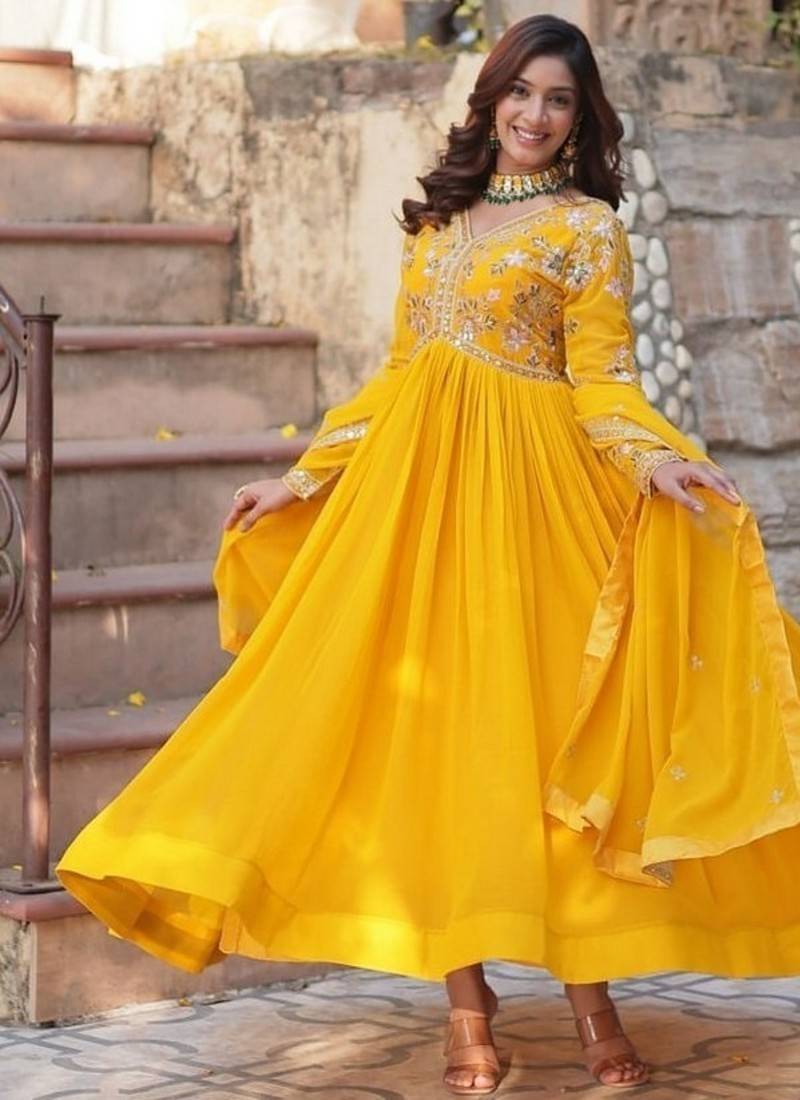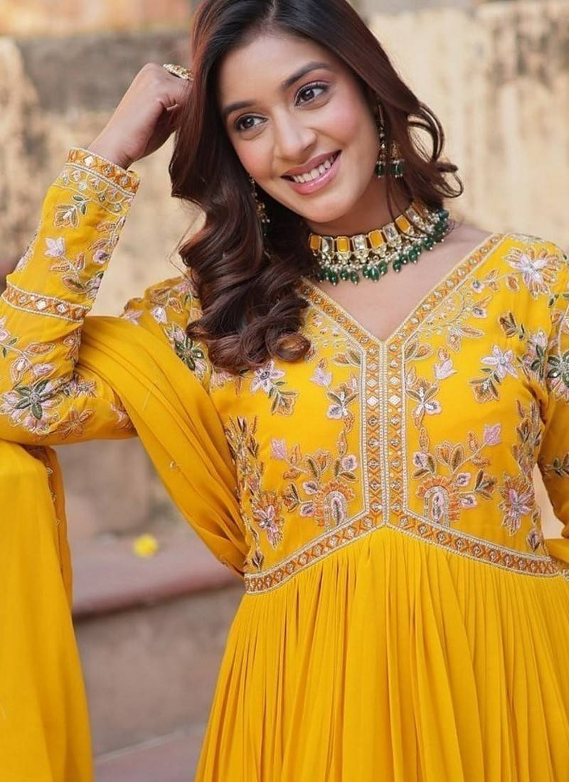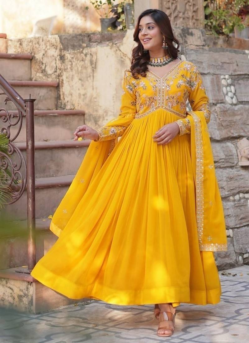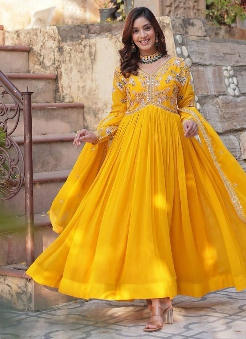 | Product Name | Yellow Zari & Sequins Embroidered Work Georgette Stitched Kurta & Dupatta Set | |