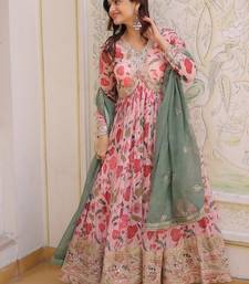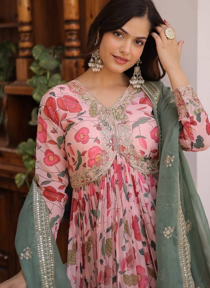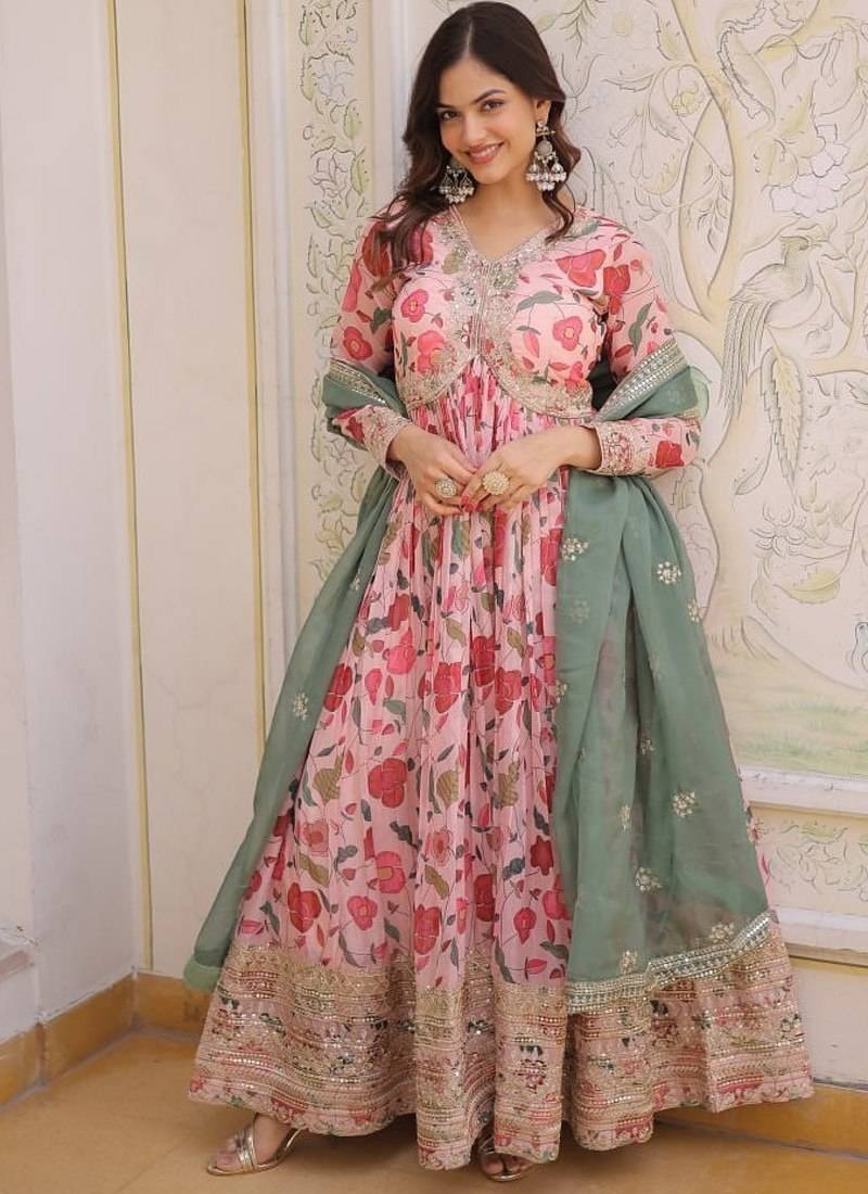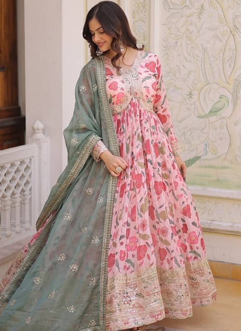 Digital printed russian silk with embroidery zari sequins-work stitched