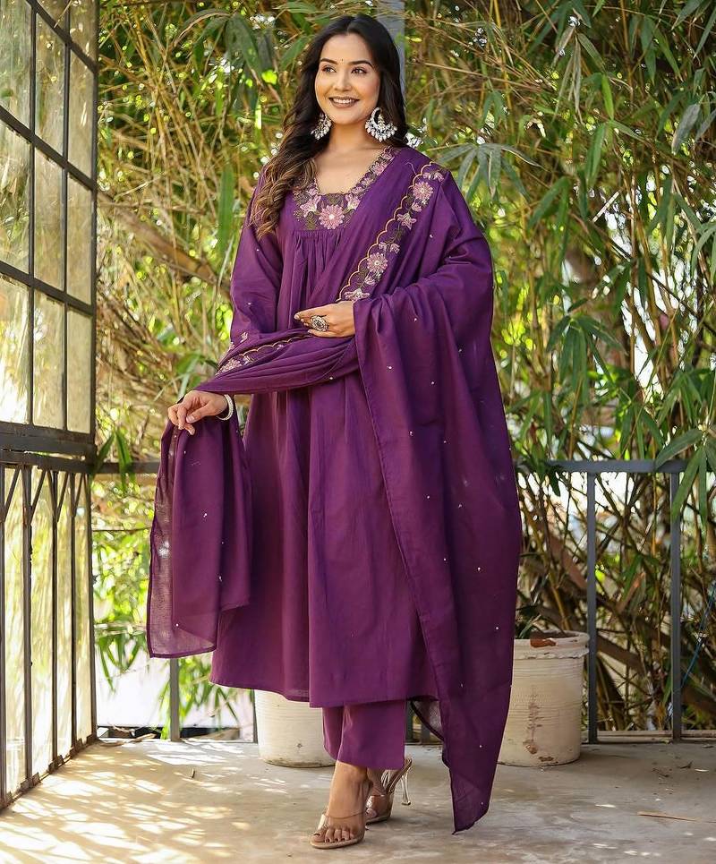 Women's rayon silk floral embroidered purple kurta pant set with chanderi dupatta stitched