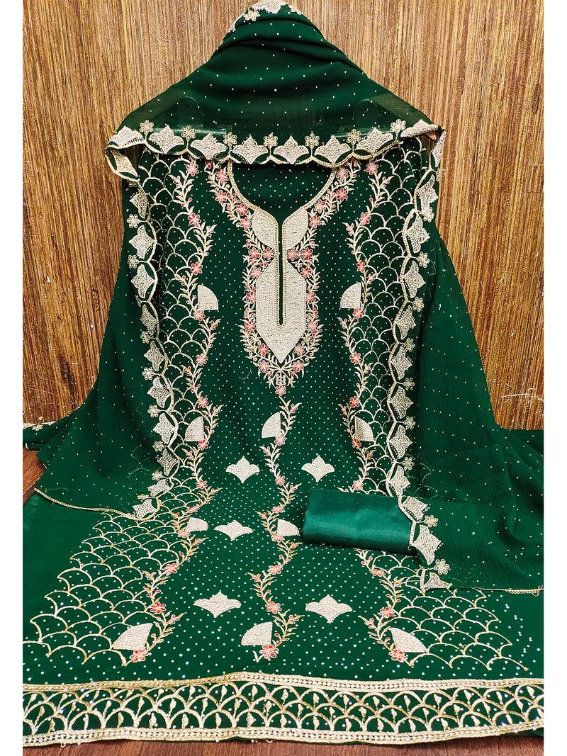 Designer dark green georgette embroidered salwar suit material with statement neckline unstitched