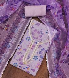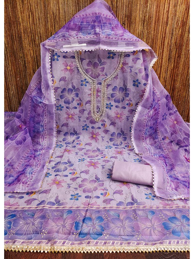 Lavender floral printed organza salwar suit material with embroidered neckline unstitched