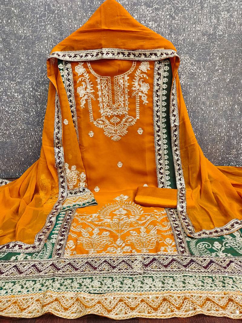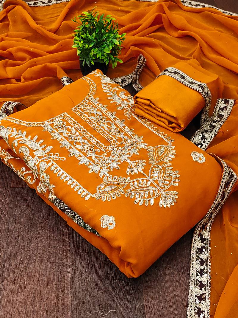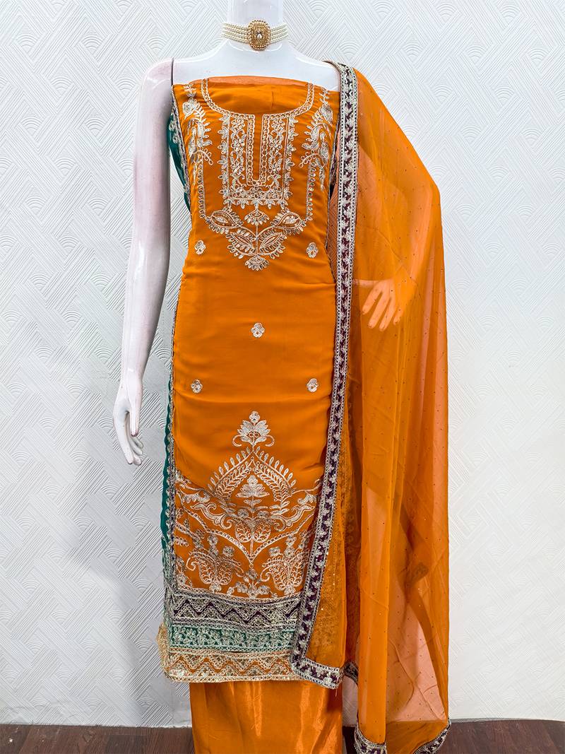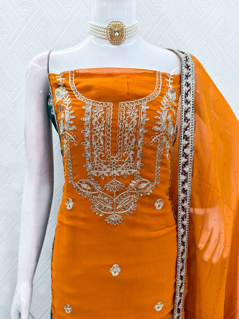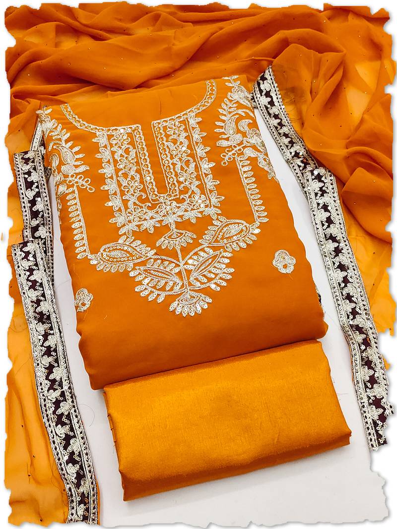 Product Name Women's Orange Georgette Salwar Suit Dress Material With Golden Thread Embroidery