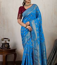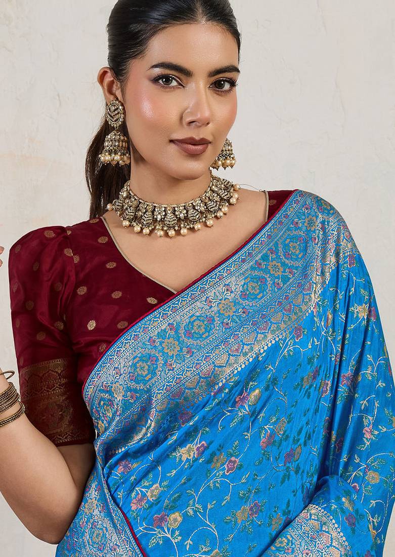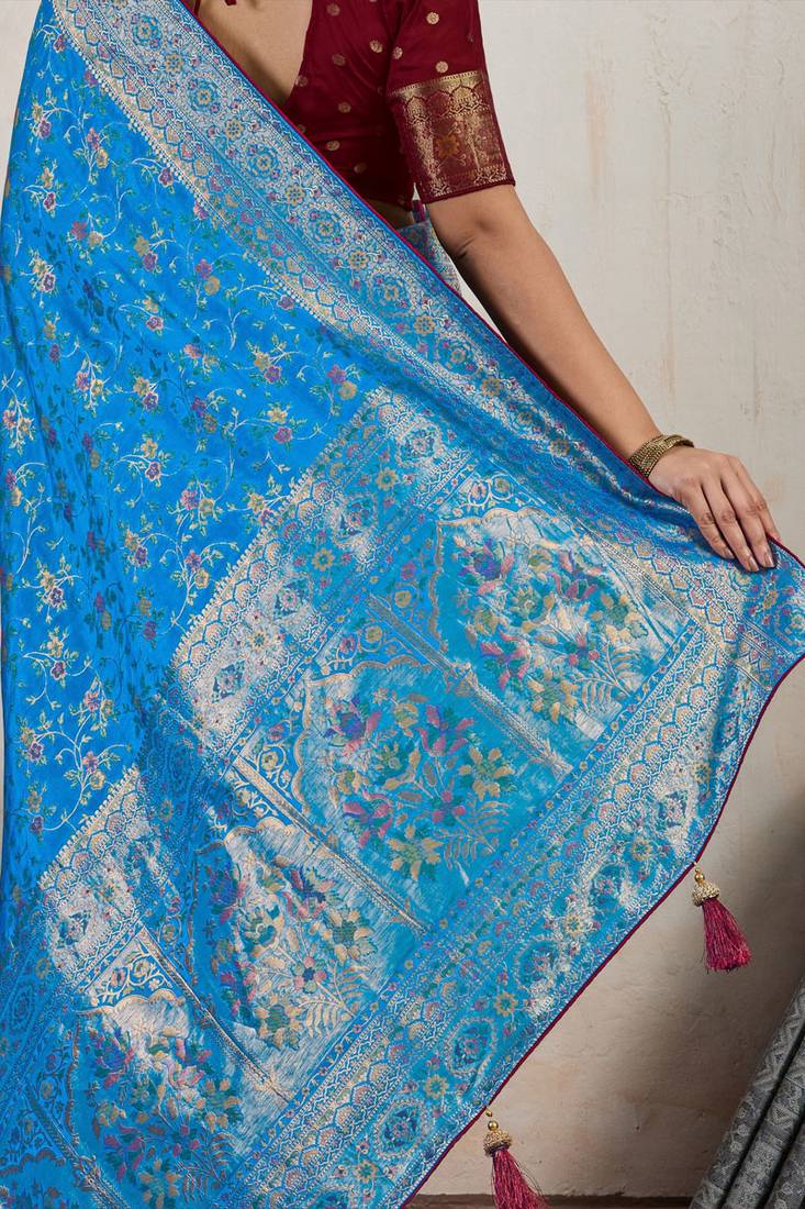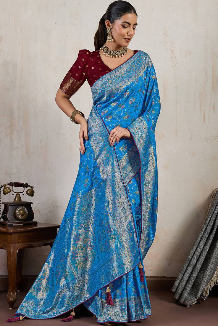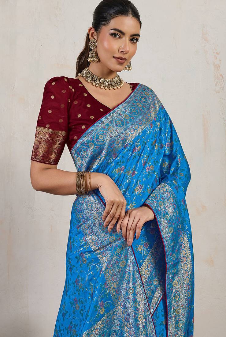 Aqua blue makhmal soft silk blend meenakari zari shades woven saree with blouse