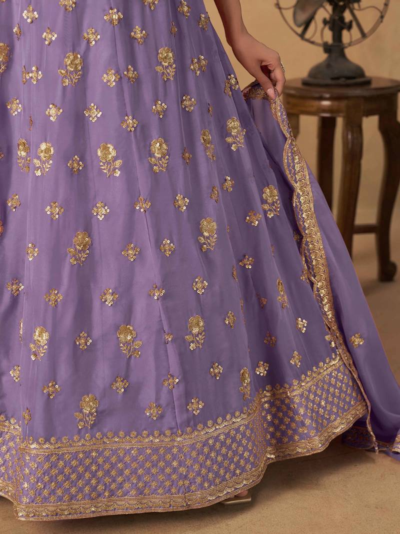 Lavender organza heavy thread embroidery sequins work lehenga choli