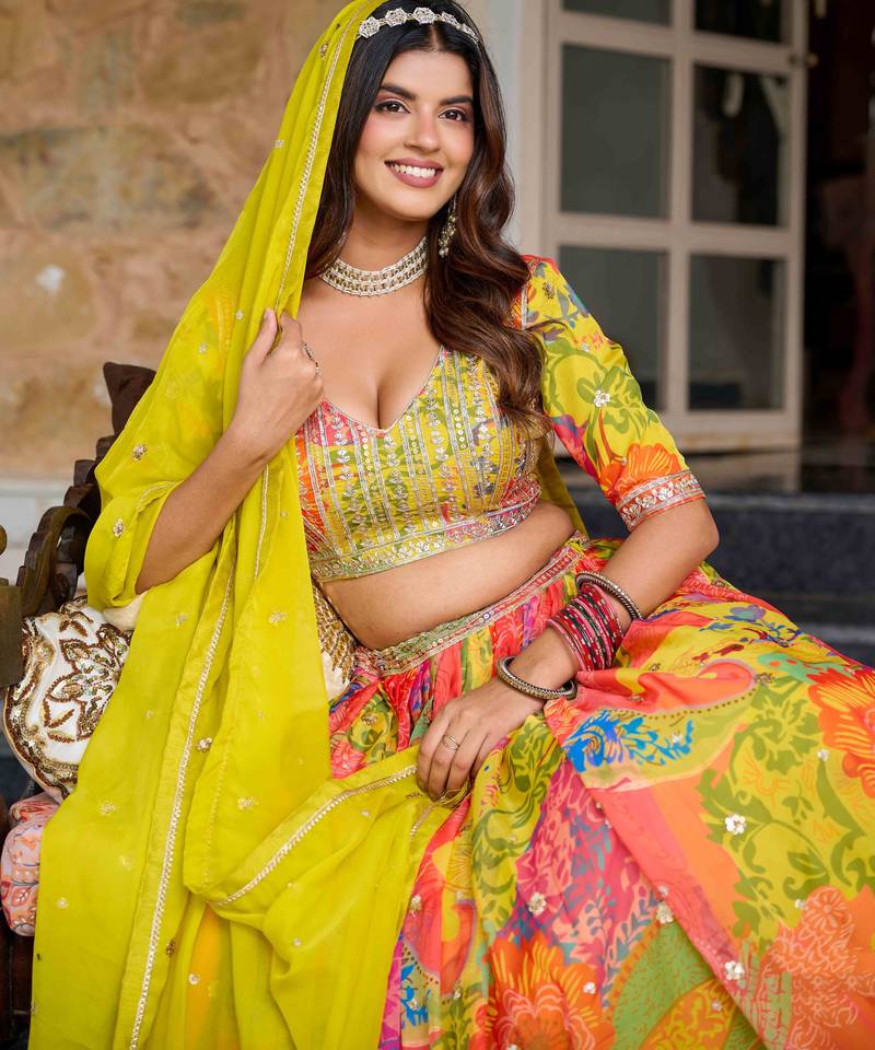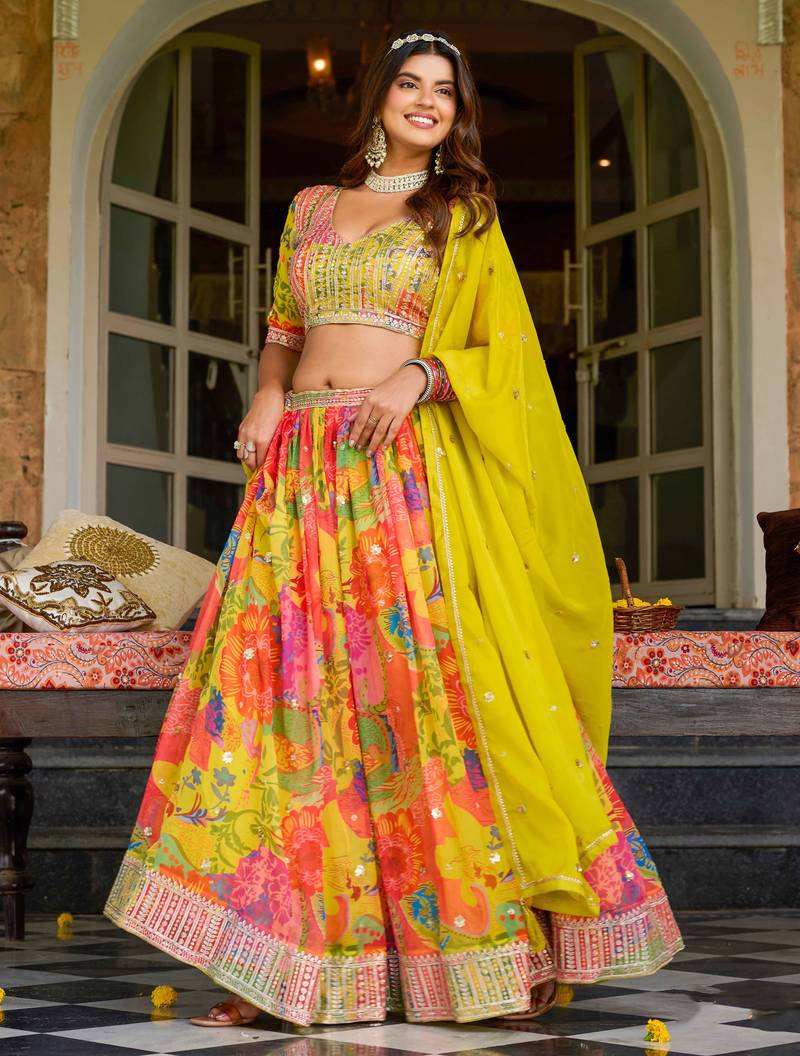 | Product Description | Lehenga Fabric: Tabby Silk, Lehenga Color Multicolor, Choli Fabric: Tabby Silk, Choli Color: Multicolor, Dupatta Fabric: Tabby Silk, Dupatta Color: Yellow, Inner Fabric: Crepe, Work: Print With Heavy Thread Embroidery Sequins Work, Remark: Lehenga Choli |