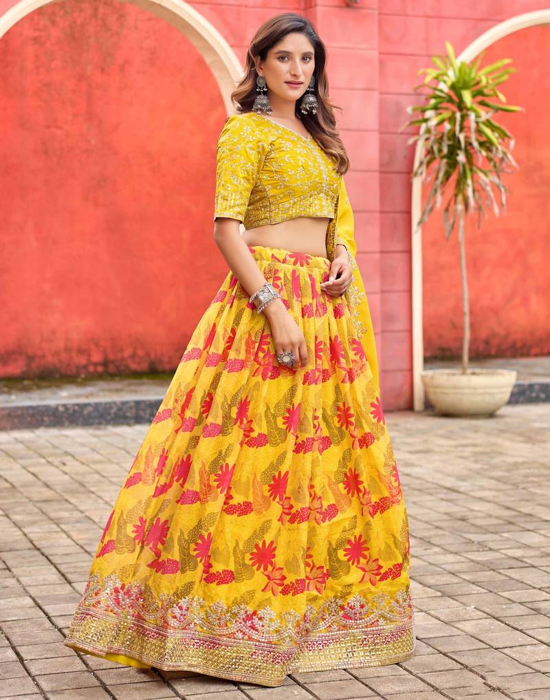 | Product Name | Mustard Taby Silk Print With Heavy Thread Embroidery Sequins Work Lehenga Choli | |