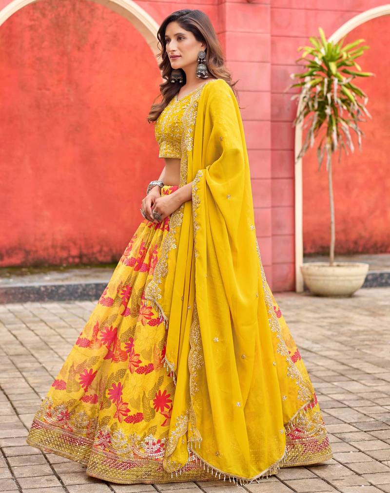 Mustard taby silk print with heavy thread embroidery sequins work lehenga choli