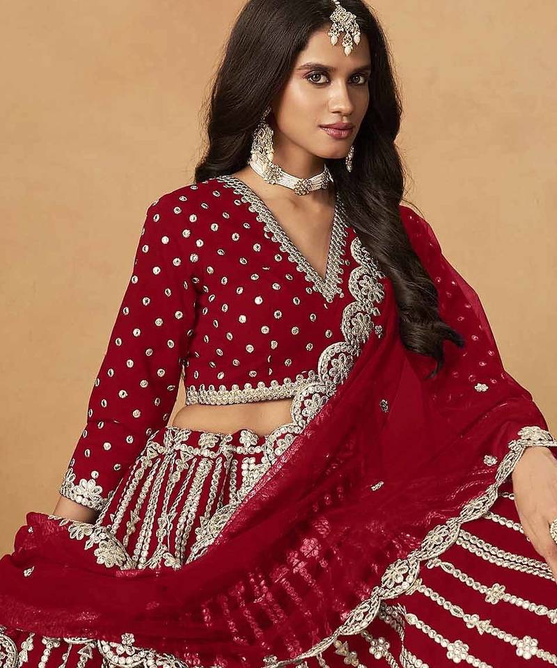 | Product Description | Lehenga Fabric: Art Silk, Lehenga Color Red, Choli Fabric: Art Silk, Choli Color: Red, Dupatta Fabric: Net, Dupatta Color: Red, Inner Fabric: Crepe, Work: Heavy Thread Embroidery Gota Work, Remark: Lehenga Choli |