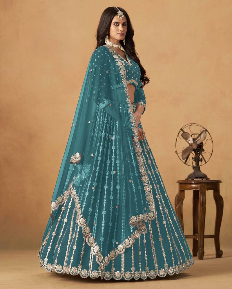 | Product Description | Lehenga Fabric: Art Silk, Lehenga Color Teal, Choli Fabric: Art Silk, Choli Color: Teal, Dupatta Fabric: Net, Dupatta Color: Teal, Inner Fabric: Crepe, Work: Heavy Thread Embroidery Gota Work, Remark: Lehenga Choli |