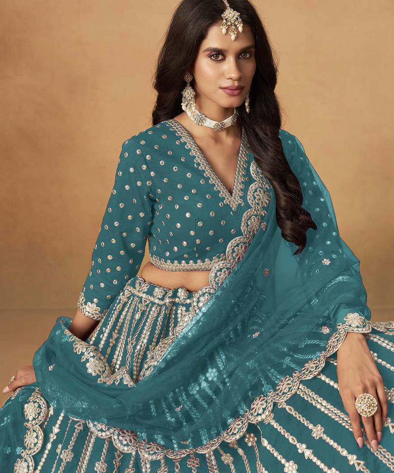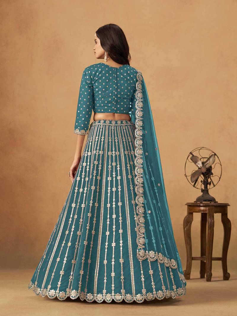 Teal art silk heavy thread embroidery gota work lehenga choli