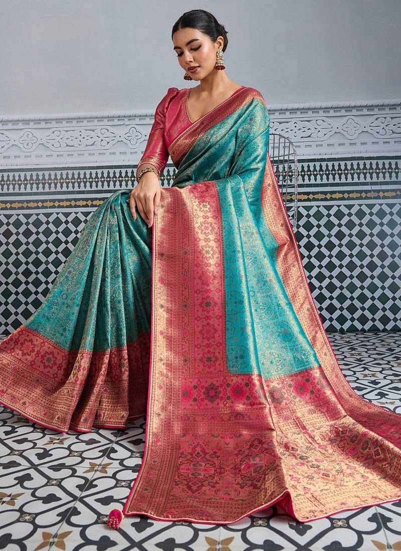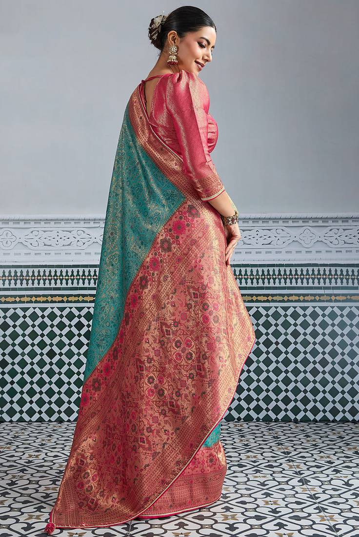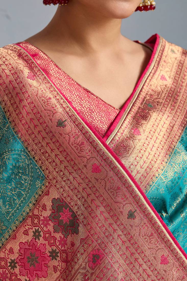 | Product Description | Saree Fabric: Kanjivaram Mul Silk, Saree Color: Teal, Blouse Fabric: Kanjivaram Mul Silk, Blouse Color: Rani Pink, Work: Zari Meenakari Woven All Over The Saree With Broad & Intricate Patta, Exquisite Grand Pallu, Remark: Saree With Blouse |