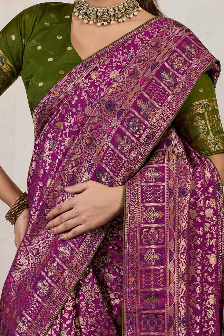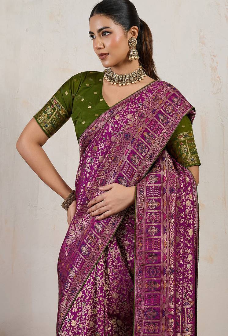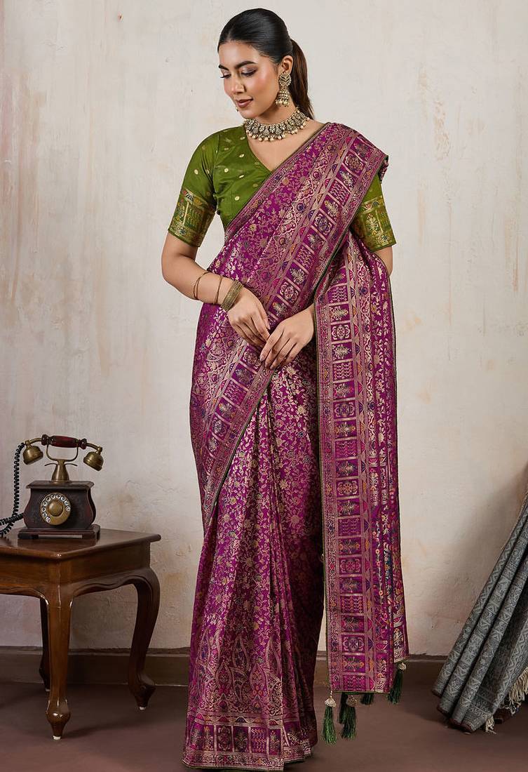 Wine makhmal soft silk blend meenakari zari shades woven saree with blouse