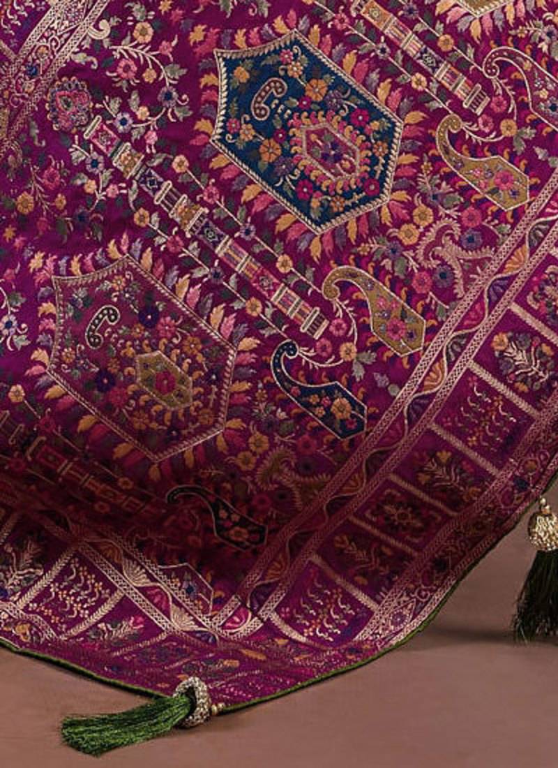 | Product Description | Saree Fabric: Makhmal Soft Silk, Saree Color: Wine, Blouse Fabric: Makhmal Soft Silk, Blouse Color: Mehendi, Work: Meenakari With 3 Zari Shades & 8 Color Thread Shades, Creating A Masterpiece, Grand Pallu, Broad Pattu, Remark: Saree With Blouse |