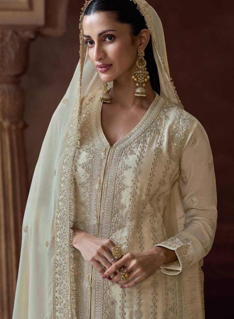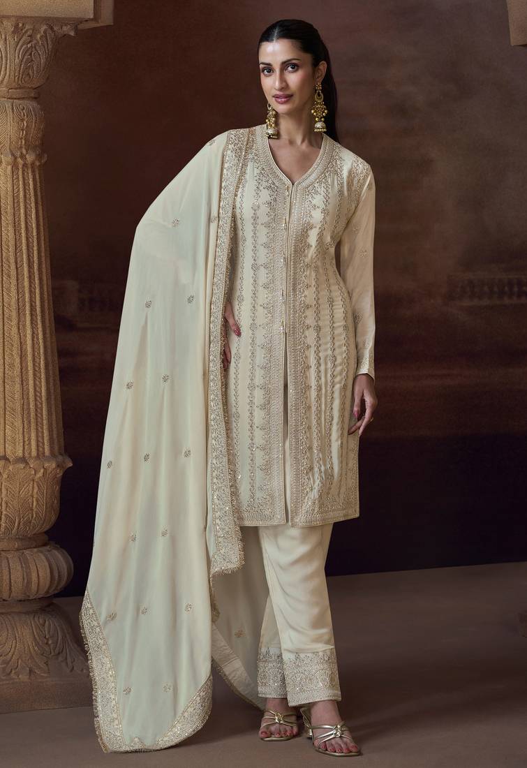 | Product Name | Beige Embroidery & Sequins Work Chinnon Silk Straight Palazzo Free Size Stitching (Size Upto 42") | |