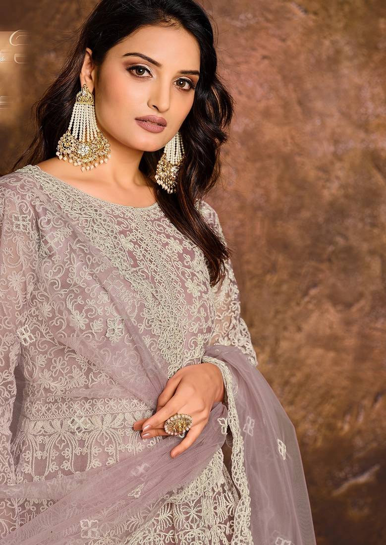 Lilac net zari work semi stitched size up to 42 salwar suits