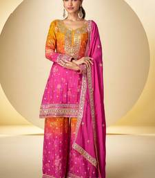 | Product Description | • Mustard & Pink Chinnon Silk Anarkali Palazzo Suit.