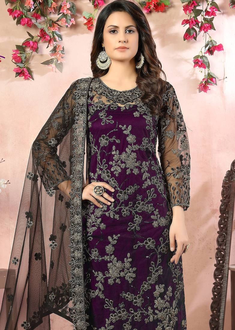 | Product Name | Purple Net Zari Work Semi Stitched Size Up To 42 Salwar Suits | |