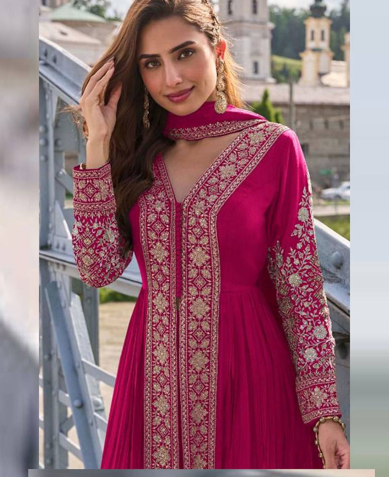 Rani pink art silk thread embroidery readymade suits free size up to 42 stitched