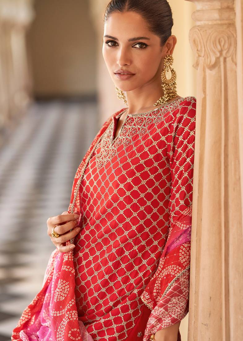 Product Name Red Art Silk Sequins Readymade Suits Free Size Up To 42