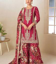 | Product Name | Red Embroidery, Hand, Sequins Work & Digital Print Chinnon Straight Palazzo Suit Free Size Stitching (Size Upto 42") | |