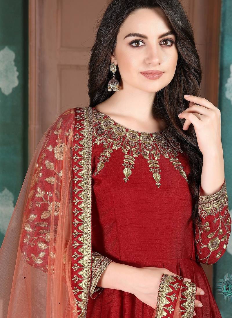 Product Name Red Silk Zari Work Semi Stitched Size Up To 42 Salwar Suits
