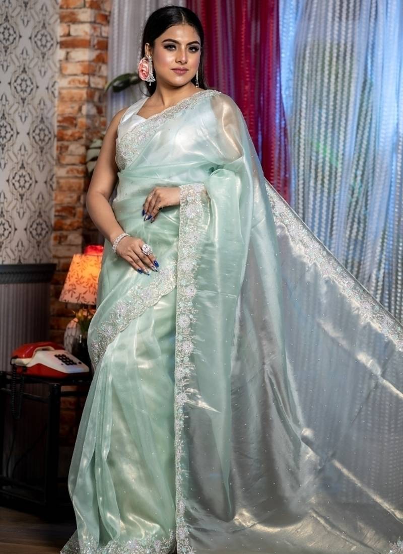 | Product Description | The Seafoam Green &Gold Dual Tone Raina Tissue Fancy Saree Is A Vision Of Subtle Grandeur & Fluid Elegance. The All Over Stone & Sequins Handwork Adds A Soft, Glistening Texture Across The Delicate Tissue Base, While The Stone &Cut Dana Handwork Floral Border Frames It With Intricate Craftsmanship.