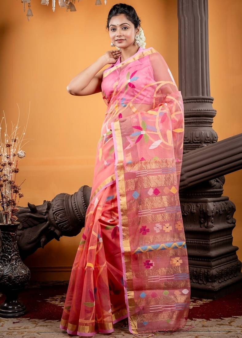 | Product Description | The Peachy Pink Premium Muslin Bengal Handloom Saree Features All Over Multi Colour Floral Jamdani Buta, Leading Into An Artistic Pallu Woven With Abstract Buta Motifs.