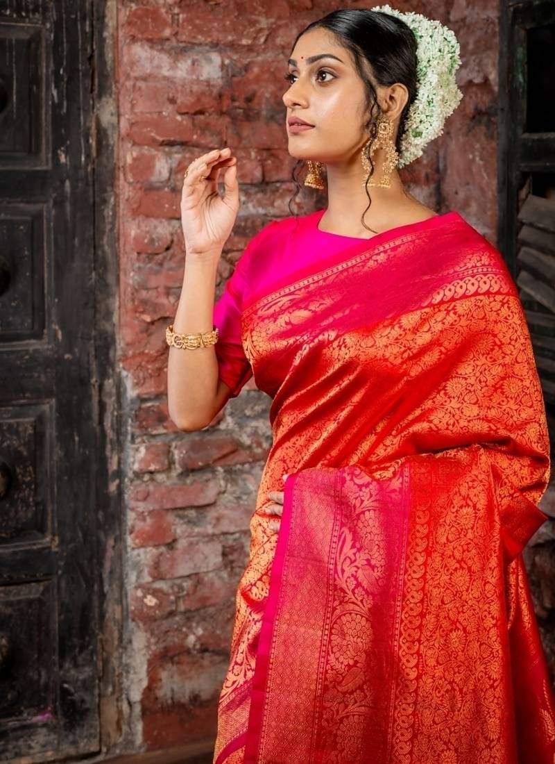 Red hand woven silk blend zari work all seasons sarees