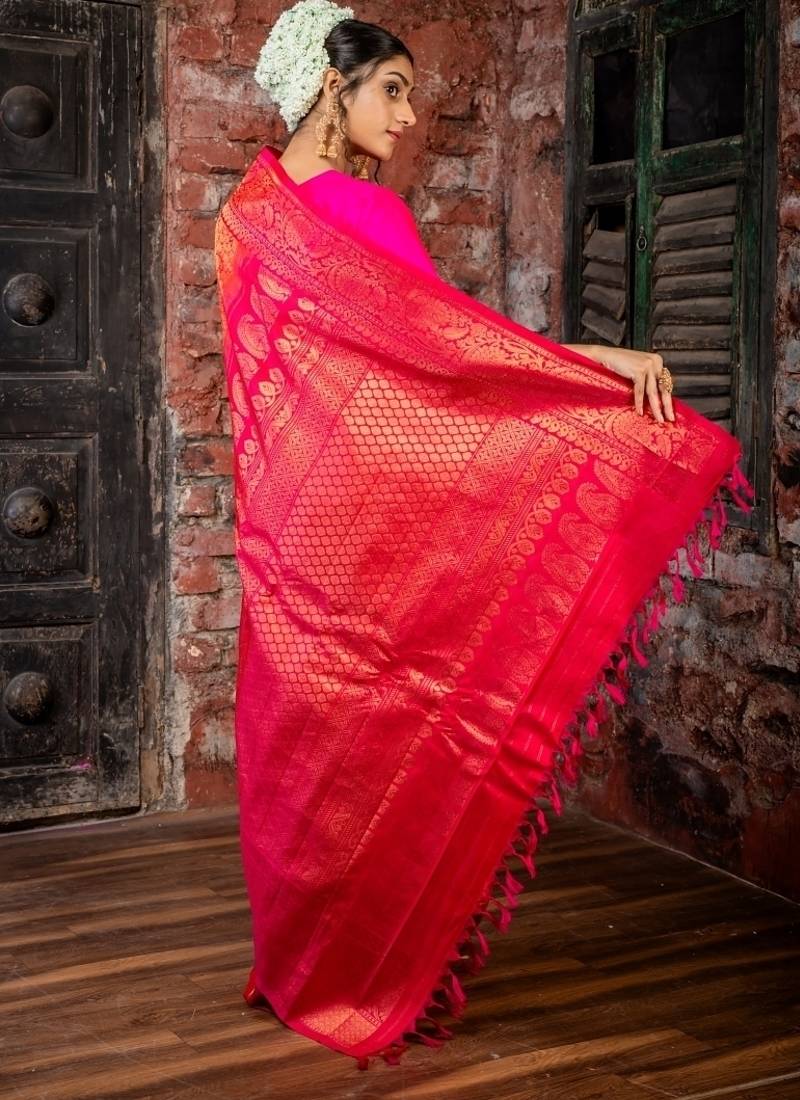 | Product Description | The Red Pure Gadwal Silk Handloom Saree Embodies Traditional Opulence. The Pure Gadwal Silk Body Is Richly Woven With Antique Gold Zari In An All Over Traditional Design, Giving The Saree A Striking, Heritage Inspired Texture. Accentuated By A Magenta & Antique Gold Zari Border & An Elegantly Woven Antique Gold Brocade Pallu, This Piece Is Made For Grandeur.