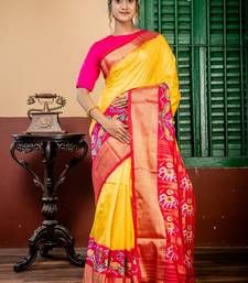| Product Description | The Bright Yellow Pure Silk Pochampally Handloom Saree Is A Radiant Expression Of Traditional Artistry. The Pure Silk Base Is Enriched With Multi Colour Ikkat Butis & Matte Gold Zari Checks Woven Seamlessly Across The Body. A Magenta Pink & Red Dual Tone Border & Pallu In Antique Gold Zari Ikkat Design With Zari Checks Highlights.
