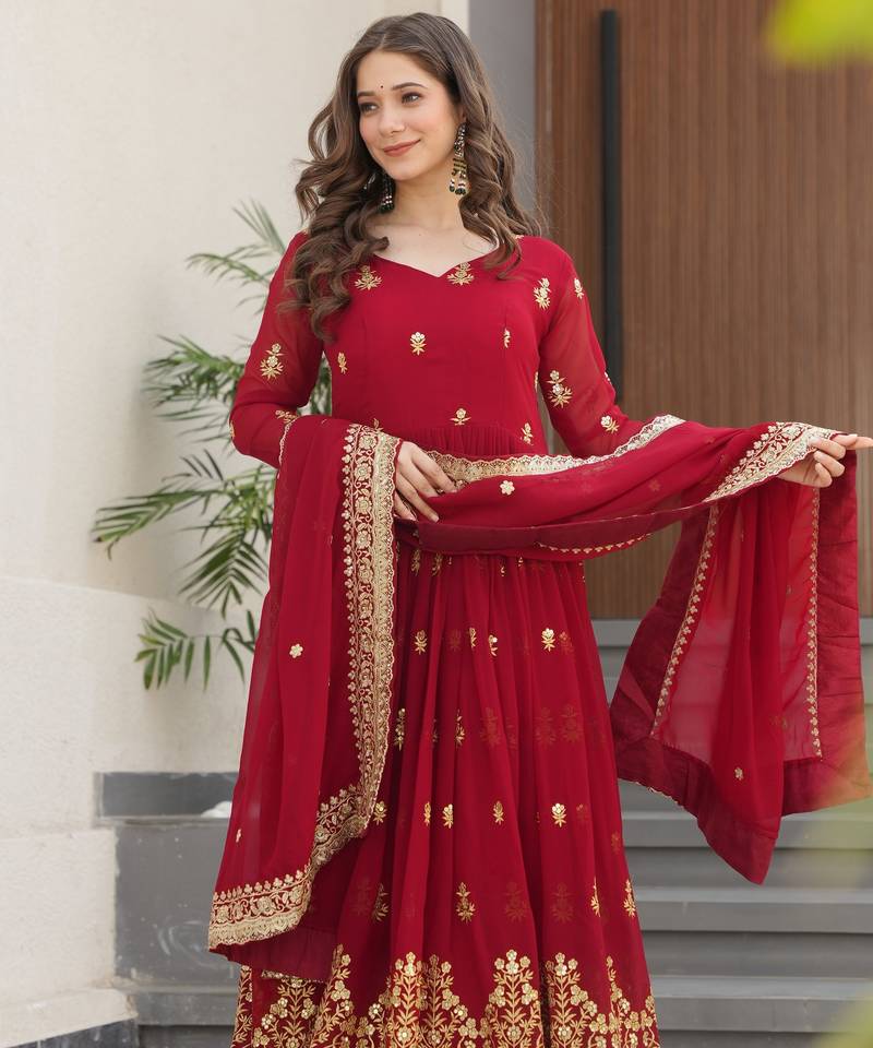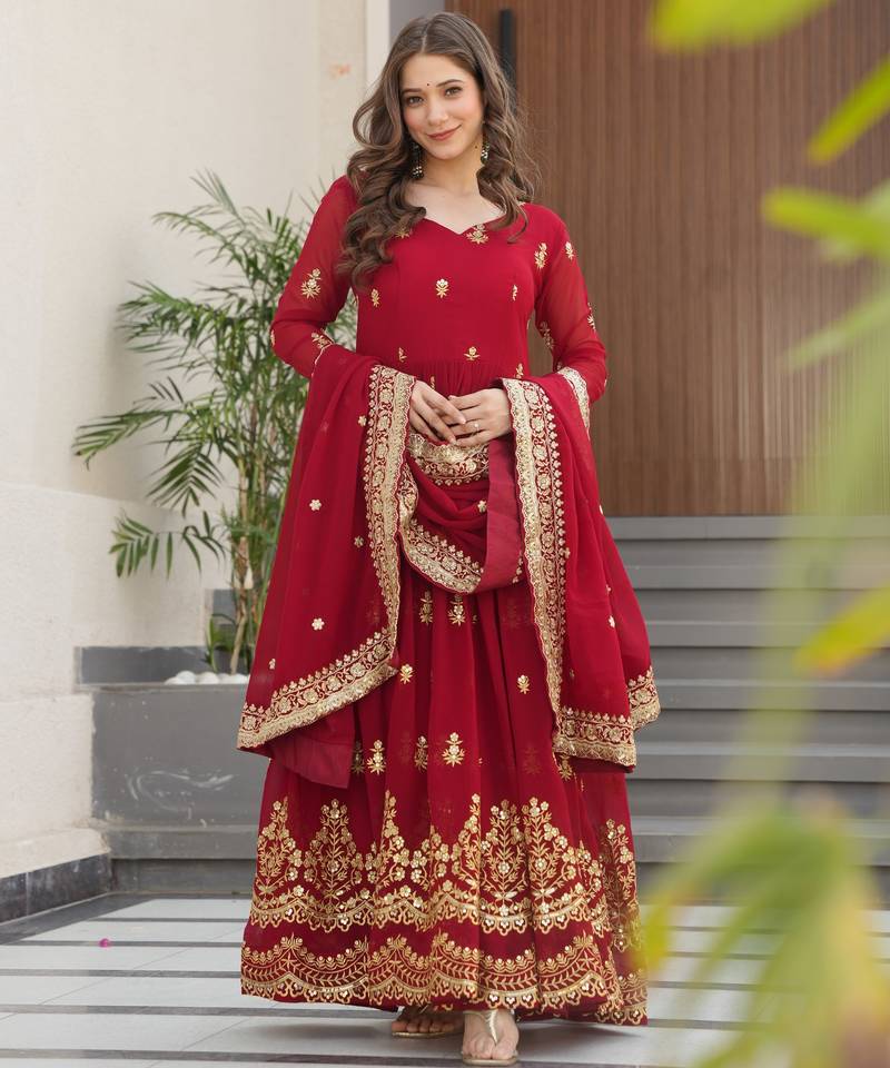 | Product Name | Maroon Faux Georgette Sequins Zari Embroidered Kurti With Dupatta | |