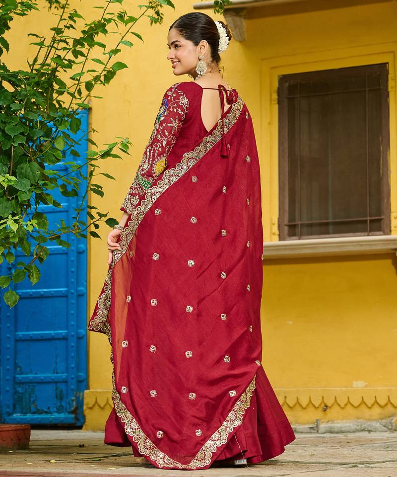 Maroon vichitra silk with rich embroidered zari & thread work gown and duptta