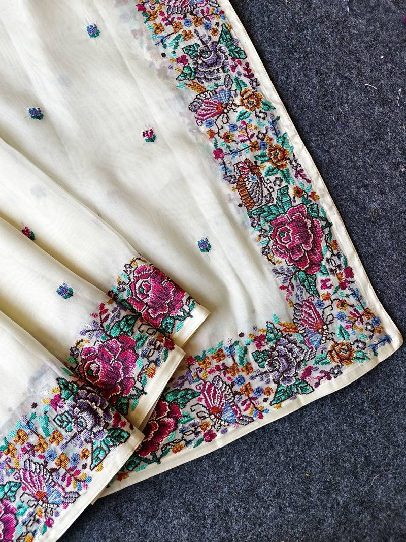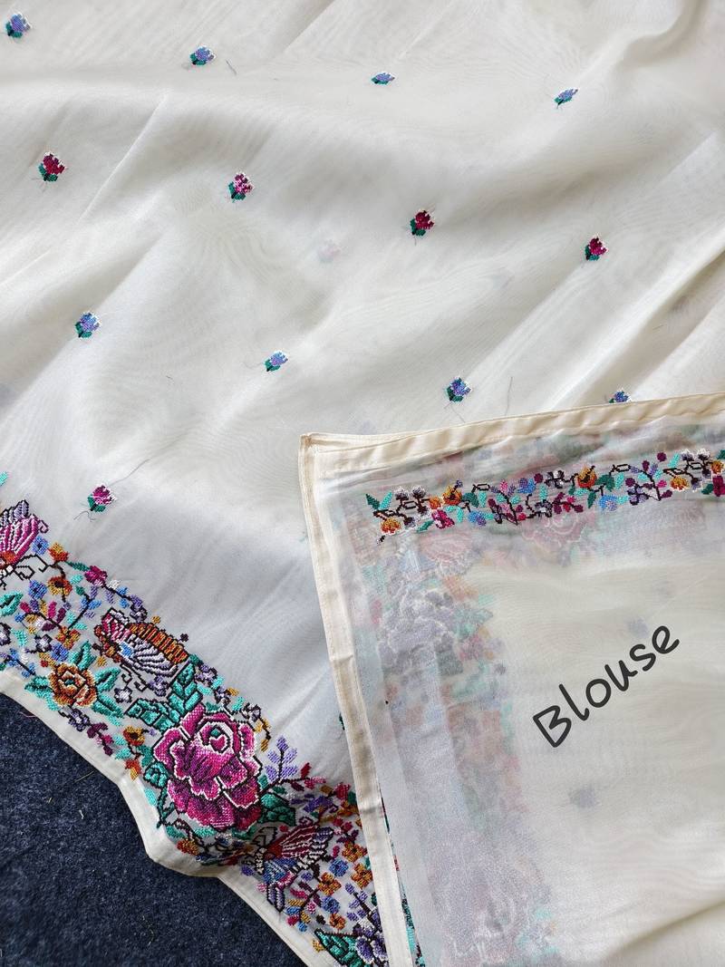 | Product Description | Pure White Tissue Viscose Fabric Saree With Flower Designed Petit Point Embroidory