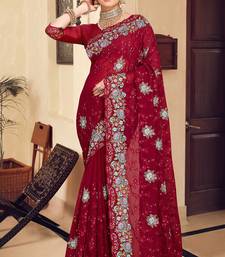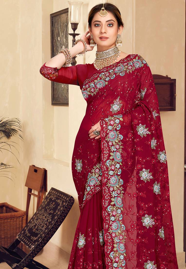 Maroon sequin zari resham stone embroidered georgette designer saree for women