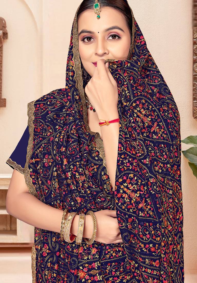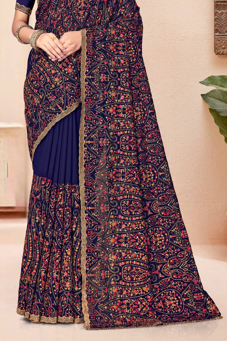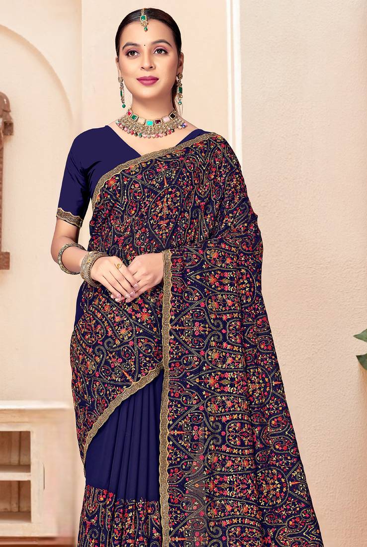 | Product Name | Navy Blue Kashmiri Resham Embroidery Work Georgette Saree For Women | |