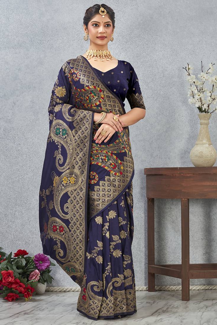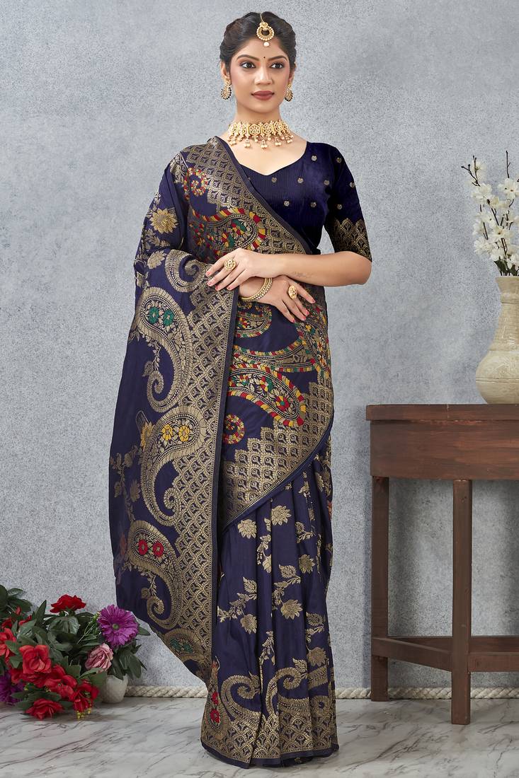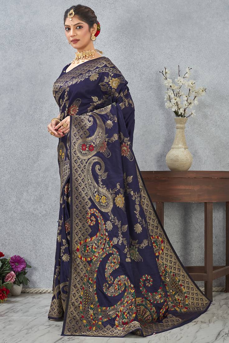 Product Name | Navy Blue Sequin Zari Resham Embroidered Banarasi Silk Saree | |