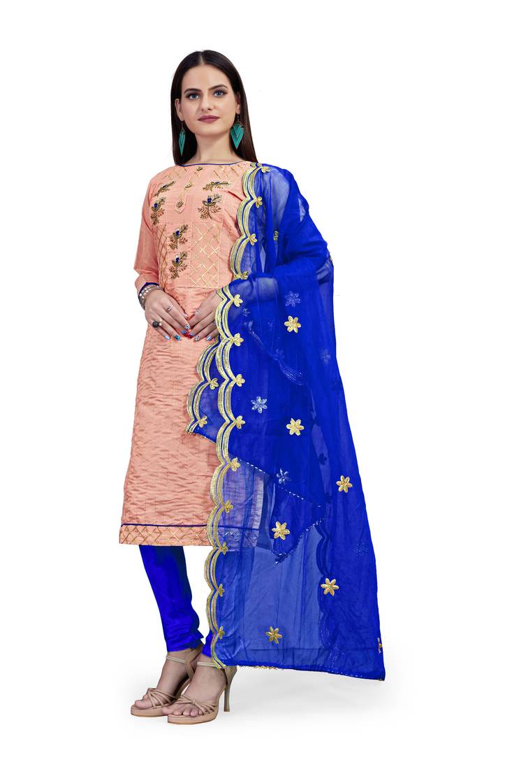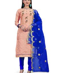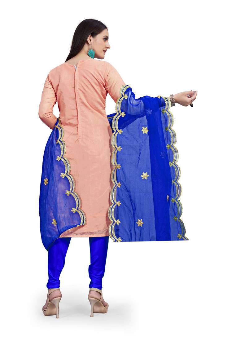 Women's Peach Unstitched Designer Embrodiery And Fancy Border With Embrodiered Dupatta Chanderi Dress Material Having Blue Color Bottom Of Cotton Fabric And Blue Color Dupatta Of Organza Material With Designer Peach Colour In Chanderi Cotton Santoon Organja Tissue Fabric With Work Of Designer Embrodiery And Fancy Border With Embrodiered Dupatta|| Images Are For The Referance Purpose Only, Color Of The Actual Product May Little Vary From The Image Due To Screen Resolution