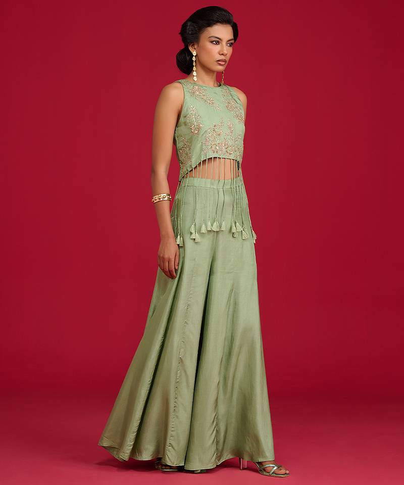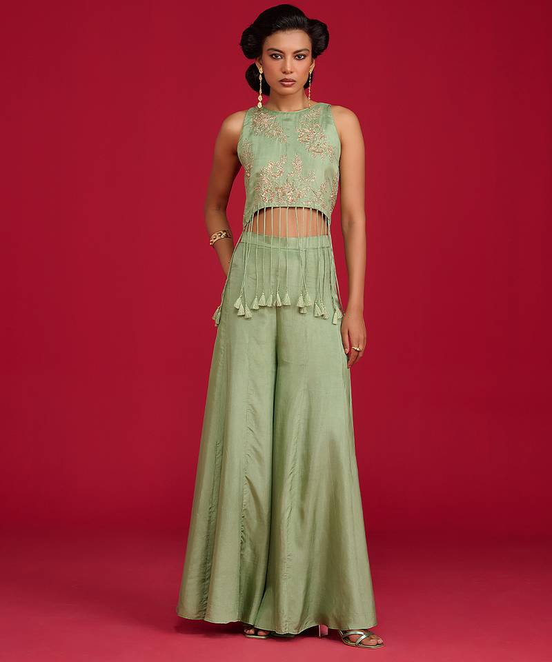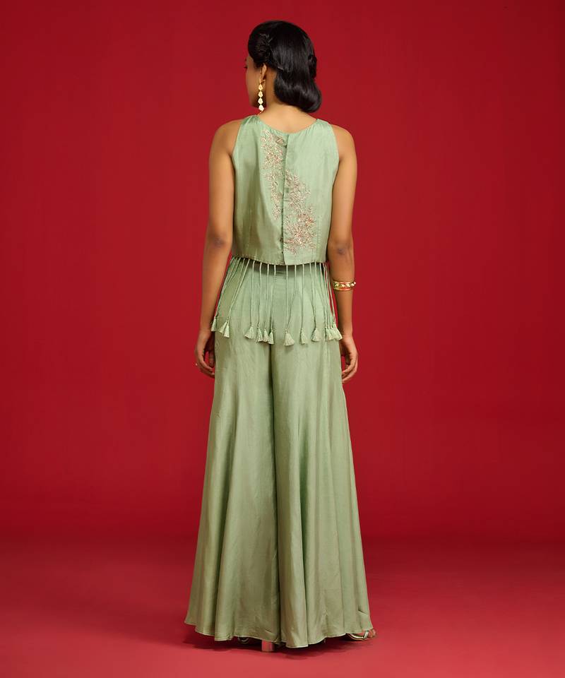 This Green Embroidered Silk Co Ord Set Blends Modern Style With Traditional Elegance. The Lustrous Silk Fabric Enhances The Intricate Embroidery, Creating A Refined Festive Look. The Coordinated Silhouette Offers Effortless Sophistication And All Day Comfort. Perfect For Weddings, Celebrations, And Special Occasions, It Delivers A Chic, Polished, And Timeless Ethnic Statement.