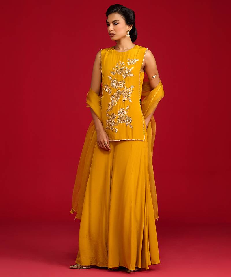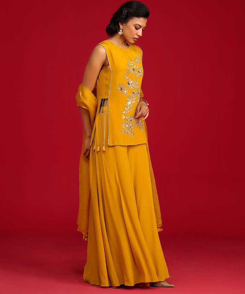 | Product Description | This Yellow Embroidered Crepe Sharara Set Exudes Graceful Charm With Its Smooth, Flowy Silhouette And Rich Hue. Intricate Embroidery Enhances Its Festive Elegance, While The Lightweight Crepe Fabric Ensures Comfort And Effortless Movement. Perfect For Weddings, Celebrations, And Special Events, It Blends Traditional Detailing With Contemporary Sophistication For A Stunning Ethnic Look.