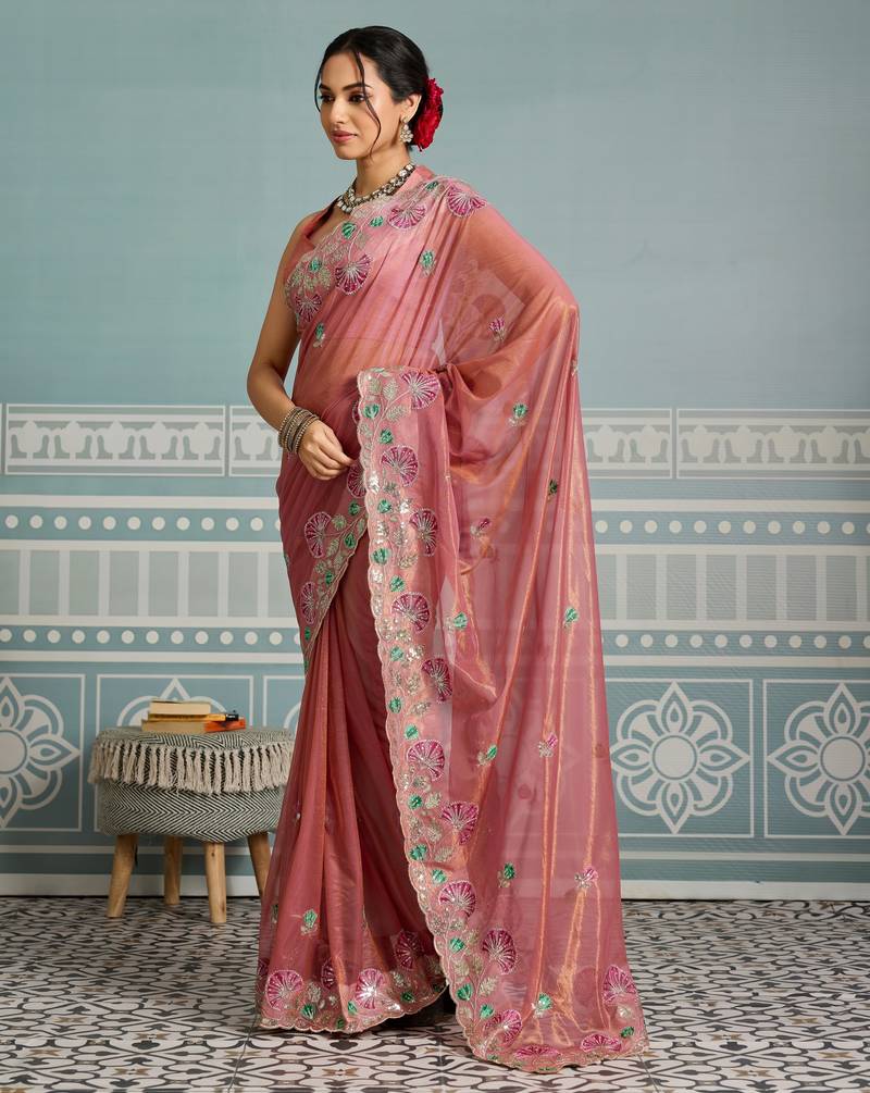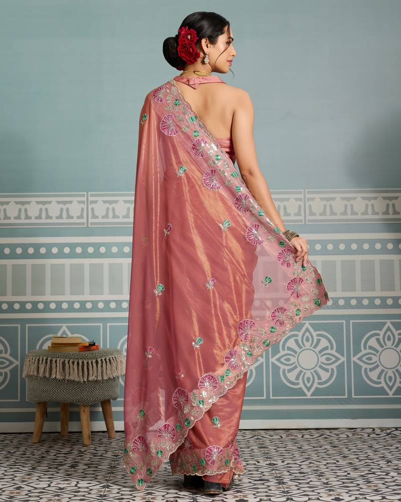 Product Name Bewitching Peach Embroidered Frendy Net Traditional Saree With Blouse