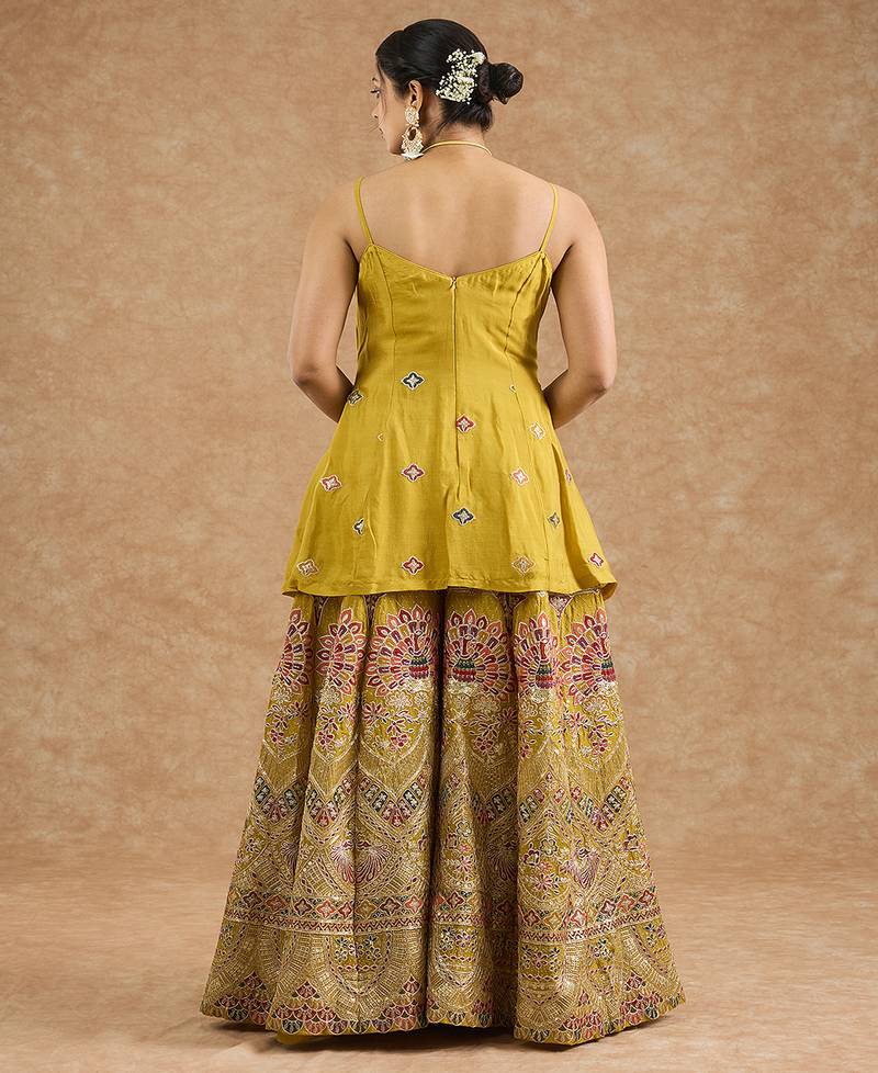 Mustard chinon multocolored thread work peplum sharara set stitched